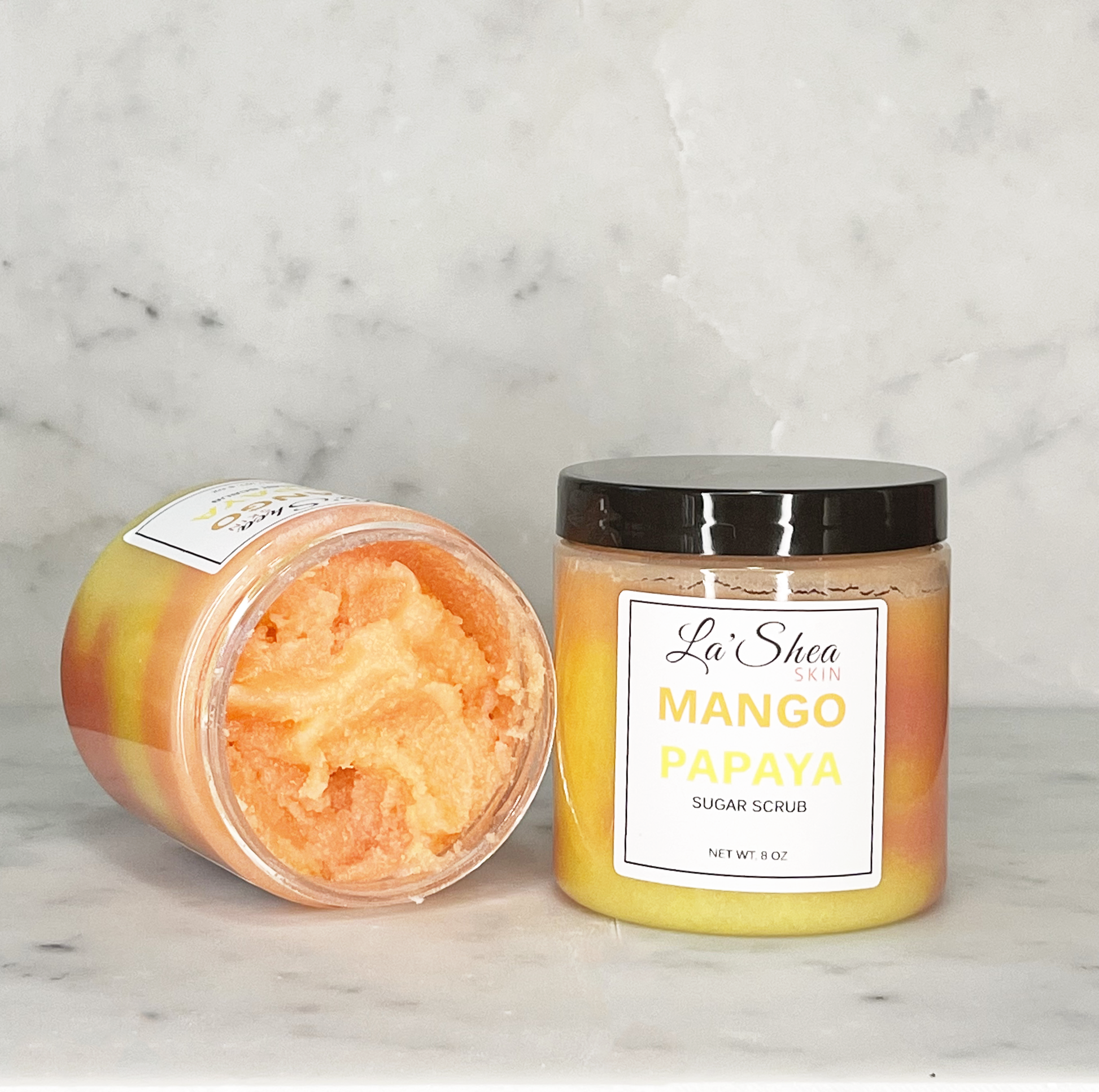 Our Mango Papaya Body Scrub smells sooo yummy, you might want to eat it! Visualize yourself on a beach with a lovely island aroma of succulent papaya and juicy chunks of mango. Cane sugar works to exfoliate dead skin away while 4 luxe oils and butters lavish your body with moisture.
