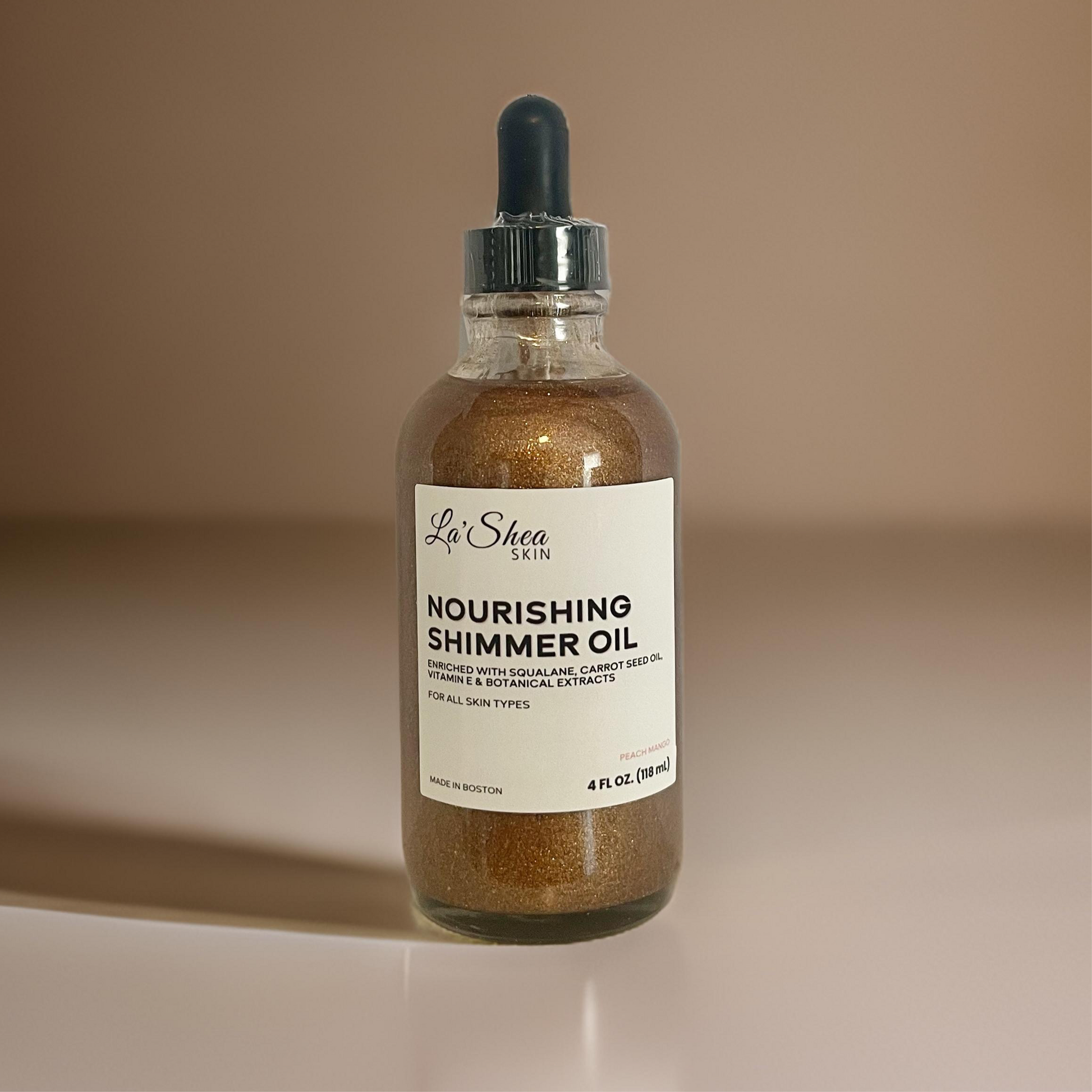 Our Nourishing Shimmer Oil is a lightweight oil elixir enriched with squalane, carrot seed oil, vitamin E & botanical extracts infused with mica for a shimmery glow.
